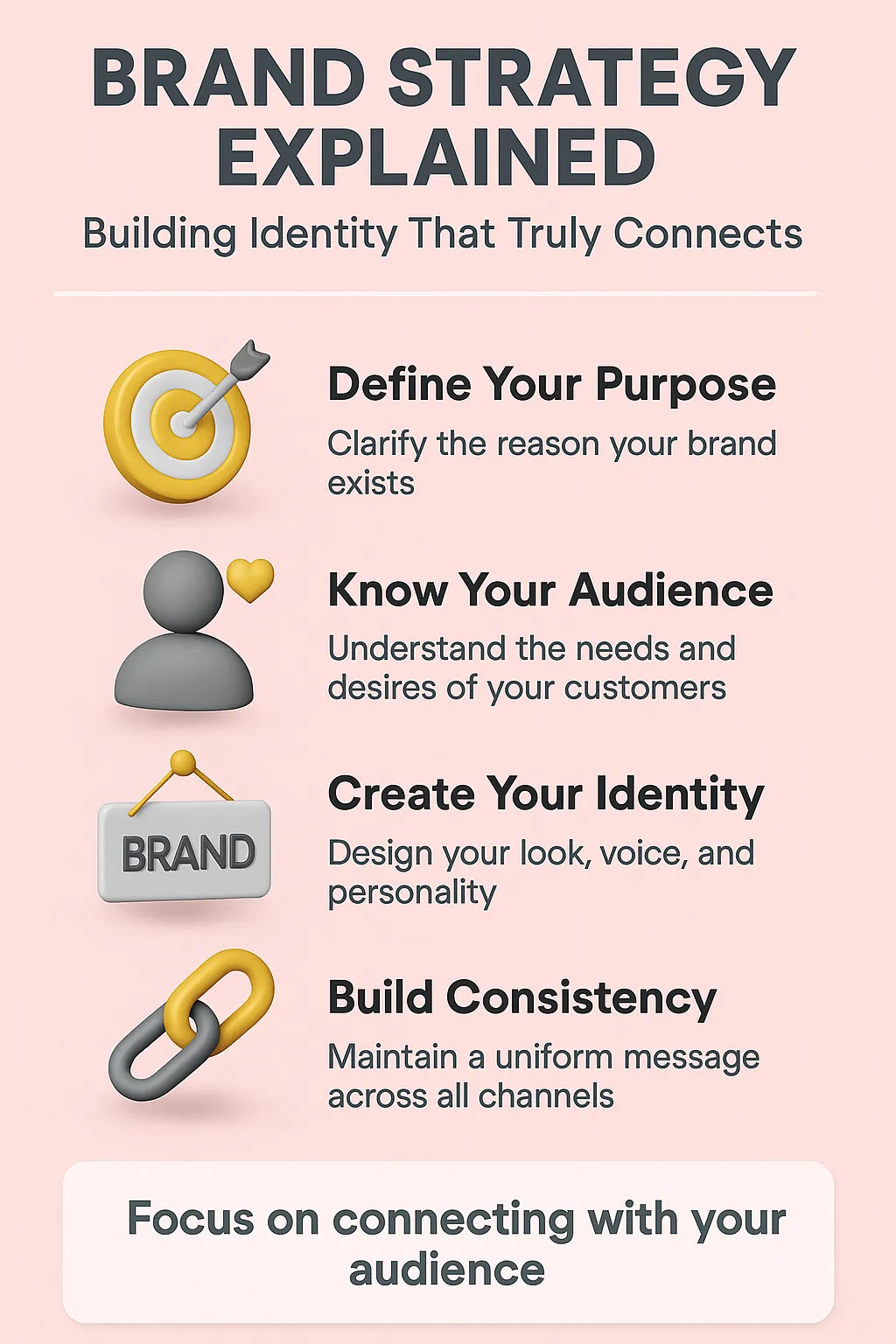 By combining clarity, consistency, and authenticity, you’re not just building a brand—you’re creating an identity that truly connects with people and inspires long-term trust.